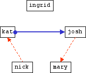 We'll further assume all these people are blogging, and have blogrolls that list all the other members of the group. In the first example, Ingrid would have the following links: <a href="http://josh.example.com/" rel="friend met">Josh</a> <a href="http://kat.example.com/" rel="met acquaintance">Kat</a> <a href="http://mary.example.com/" rel="co-worker friend met">Mary</a> <a href="http://nick.example.com/">Nick</a>